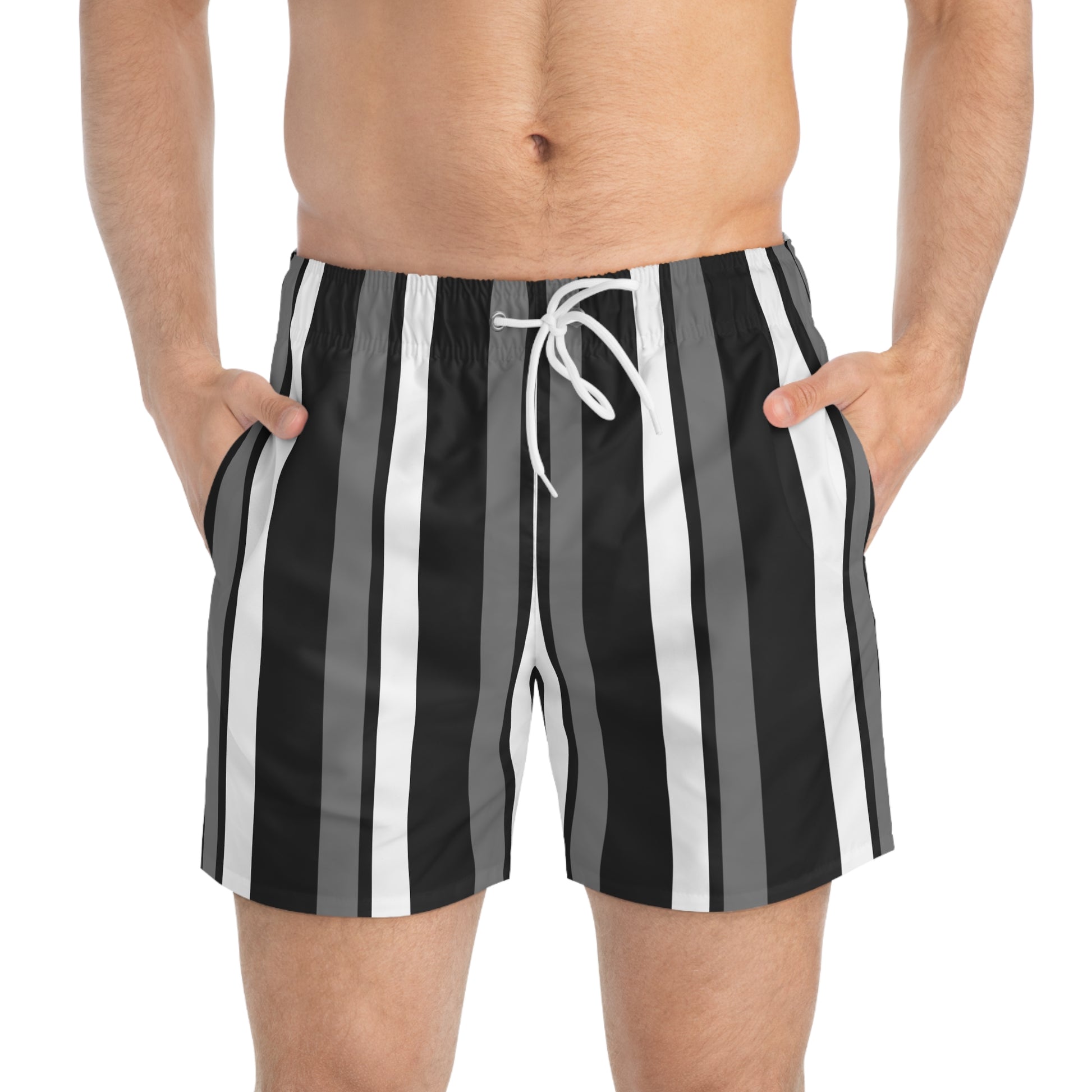 Funky 70's Style Retro Striped Swim Trunks in Monochrome Black/White/Grey